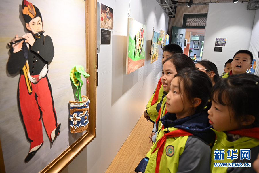 11月15日,孩子們在觀看“會動”的世界名畫吹笛少年。