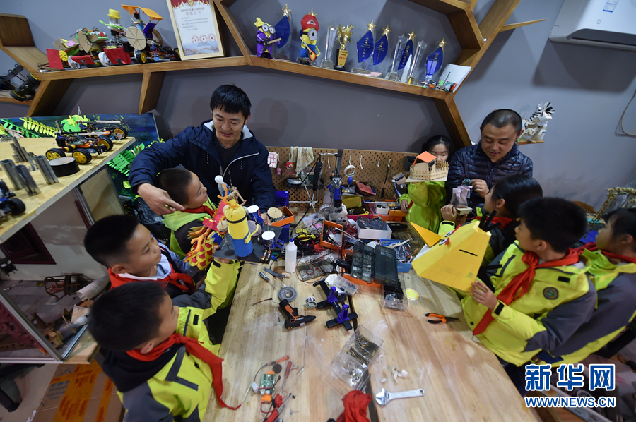 11月15日,老師在“酷玩創客”工作室指導孩子。