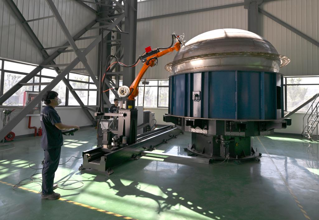 7月3日,在位於安徽省蚌埠市的深藍太空航天科技(蚌埠)有限公司,工作人員操作焊接機器人對火箭燃料貯箱箱底進行焊接。