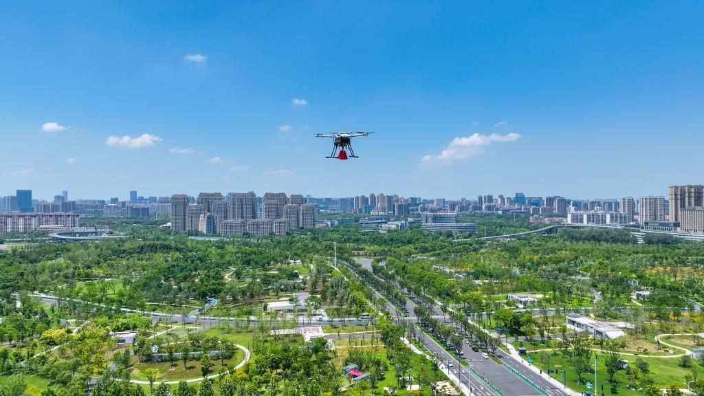 無人機在安徽省合肥市岸上草原配送外賣(2024年4月29日攝,無人機照片)。