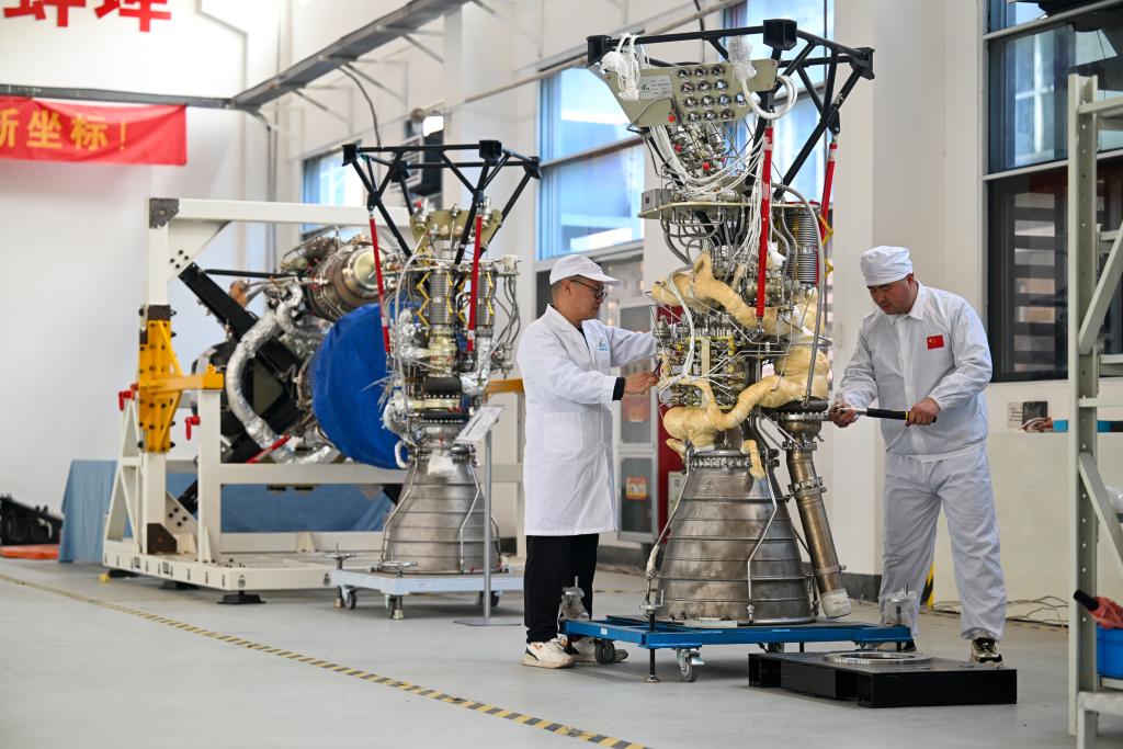 在位於安徽省蚌埠市的安徽九州雲箭航天技術有限公司,技術人員對即將交付的液體火箭發動機進行檢查(2024年3月11日攝)。