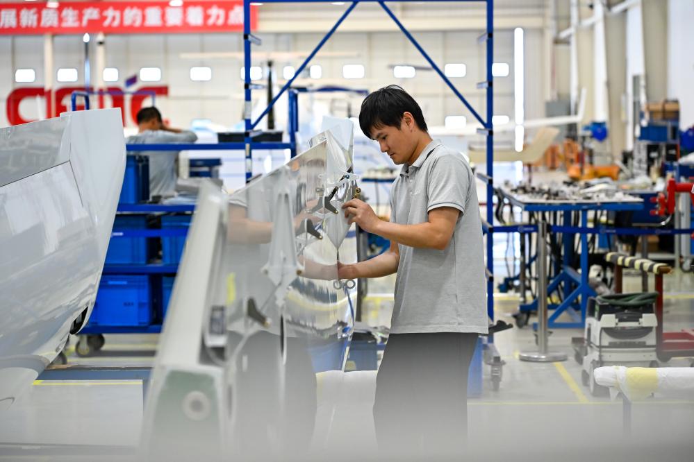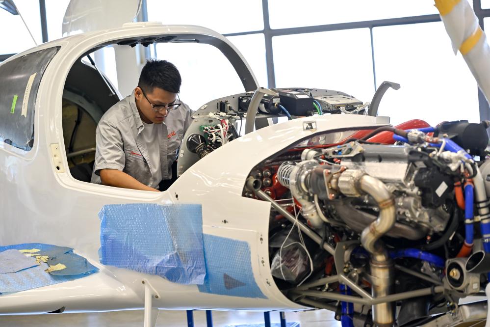 7月3日,在位於安徽省蕪湖市灣沚區的中電科蕪湖鑽石飛機製造有限公司內,工作人員在裝配一架通航飛機。