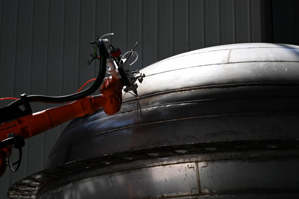 7月3日,在位於安徽省蚌埠市的深藍太空航天科技(蚌埠)有限公司,焊接機器人在對火箭燃料貯箱箱底進行焊接。