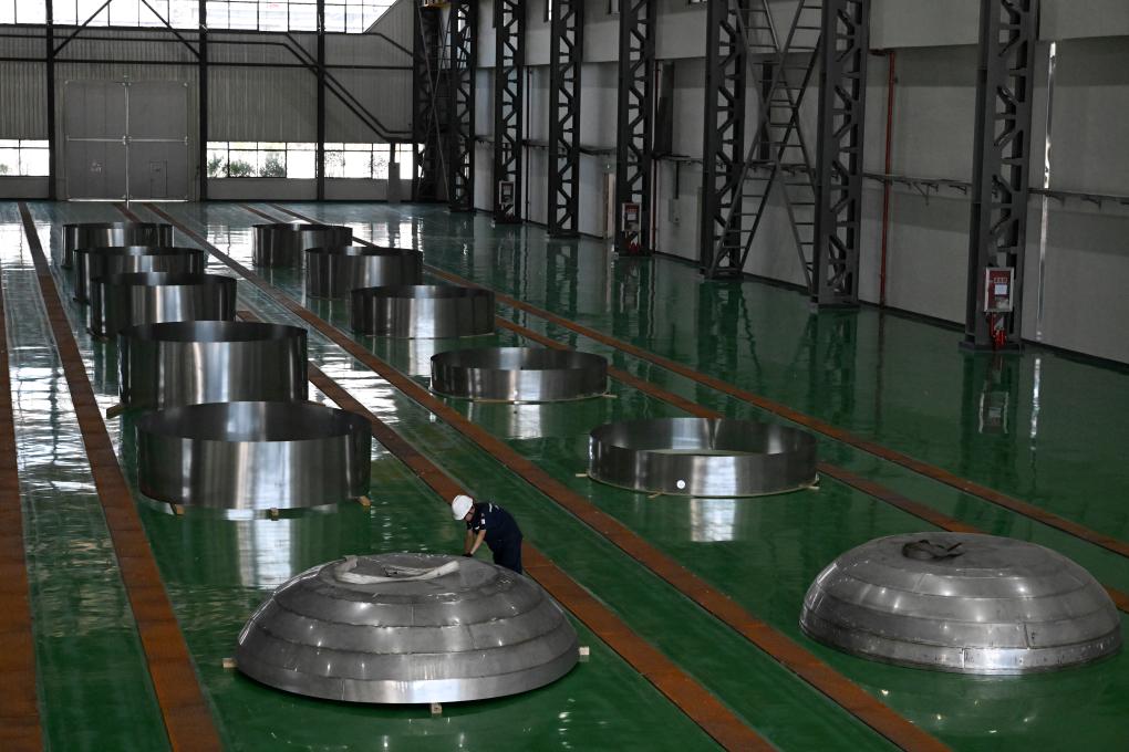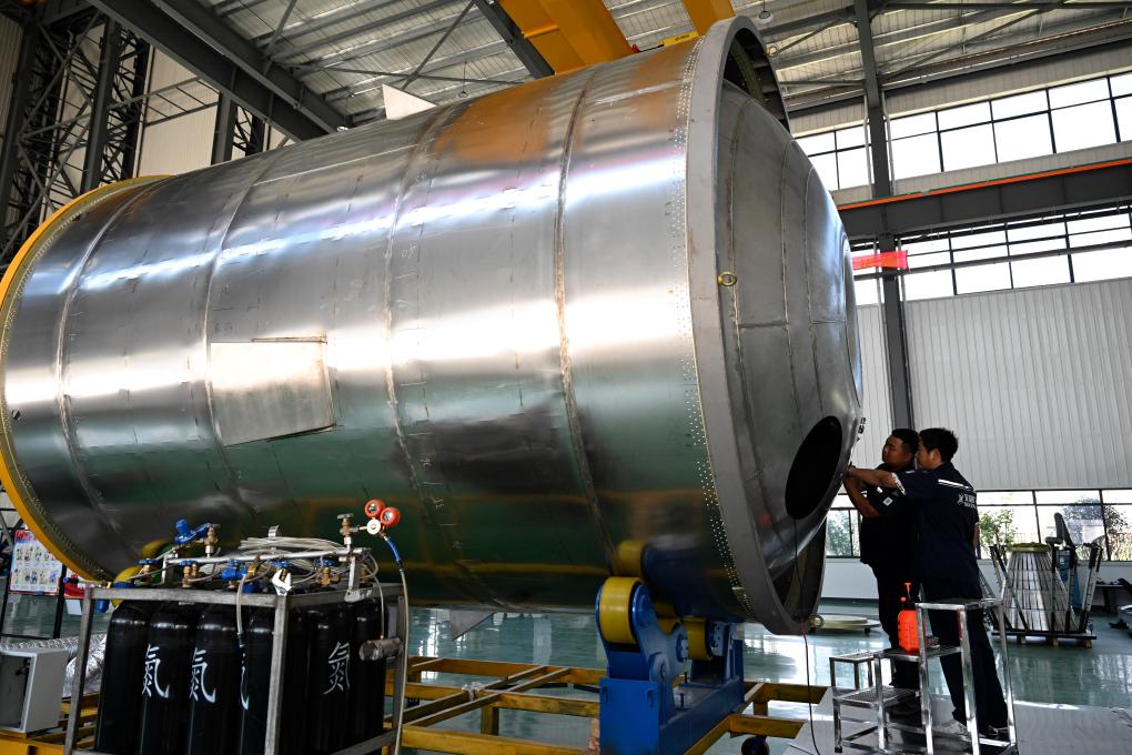 7月3日,在位於安徽省蚌埠市的深藍太空航天科技(蚌埠)有限公司,工作人員在查看火箭燃料貯箱的箱體組件。