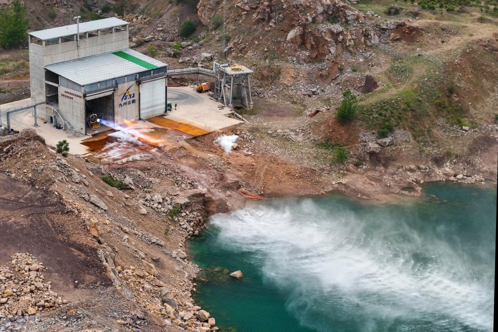 在安徽省蚌埠市禹會區大洪山火箭發動機試驗場,安徽九州雲箭航天技術有限公司研發生産的“龍雲”發動機進行點火測試(4月24日攝,無人機照片)。