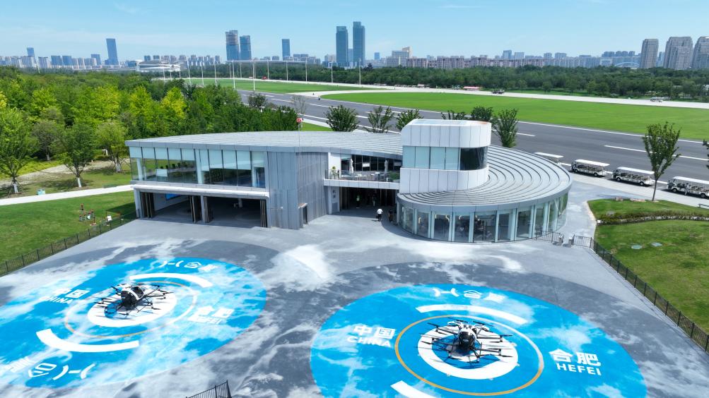 7月2日,兩架電動垂直起降飛行器(eVTOL)停放在合肥城市空中交通樞紐港(無人機照片)。