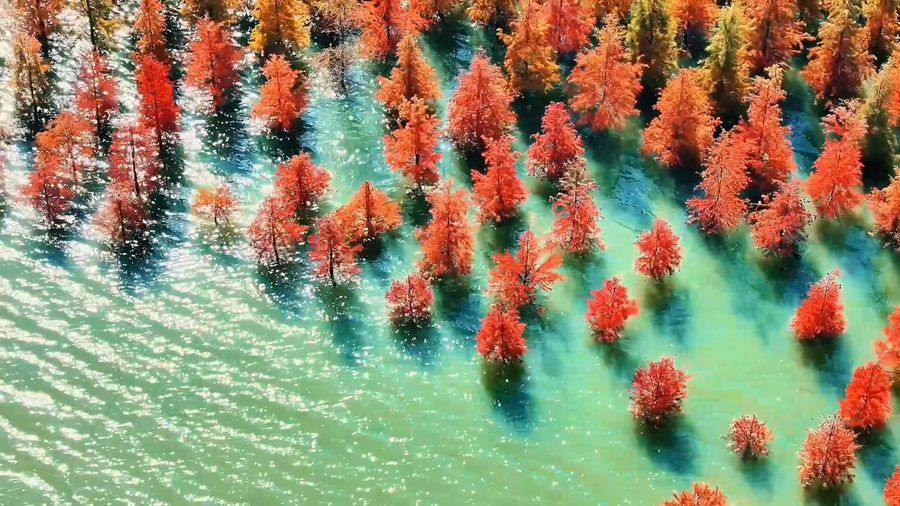 冬日時節,安徽省合肥市蜀山區風光正好。水面緋紅挺立,銀杏金黃翩躚,林間灑落碎金般的陽光,共同構成一幅絢爛的蜀山冬景圖。
