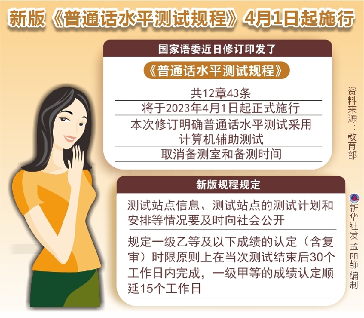 記者2月10日從教育部獲悉,國家語委近日修訂印發了《普通話水平測試規程》,共12章43條,將於2023年4月1日起正式施行。本次修訂明確普通話水平測試採用計算機輔助測試,取消備測室和備測時間。新華社發 孟麗靜 編制