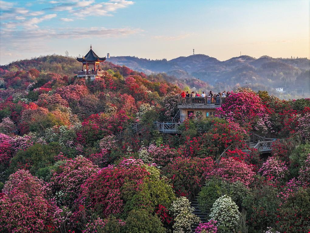 貴州烏蒙山區,&&杜鵑景區的野生杜鵑花相繼綻放,如同一條彩帶飄舞山間,這裡有面積大、種類多、保存完好的原始杜鵑林。景區管理單位舉行了祭花神等豐富的民俗活動。