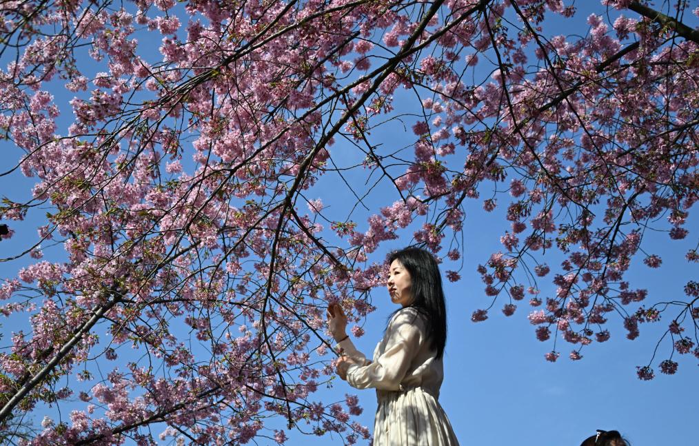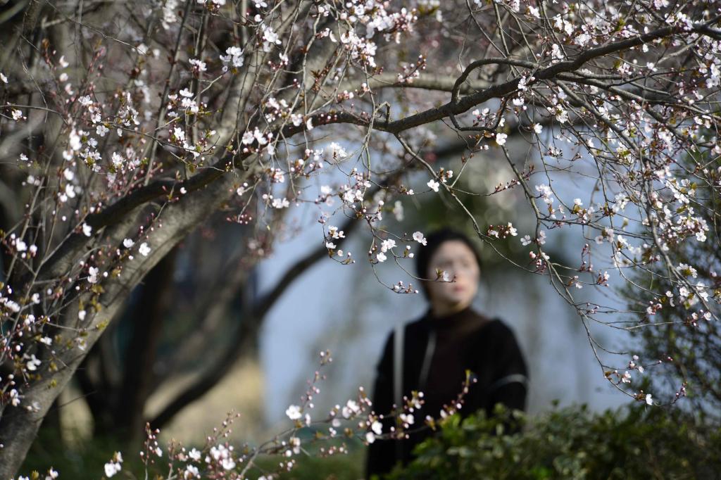 3月18日,游客在湖北省武漢市東湖櫻園賞花。新華社記者 程敏 攝