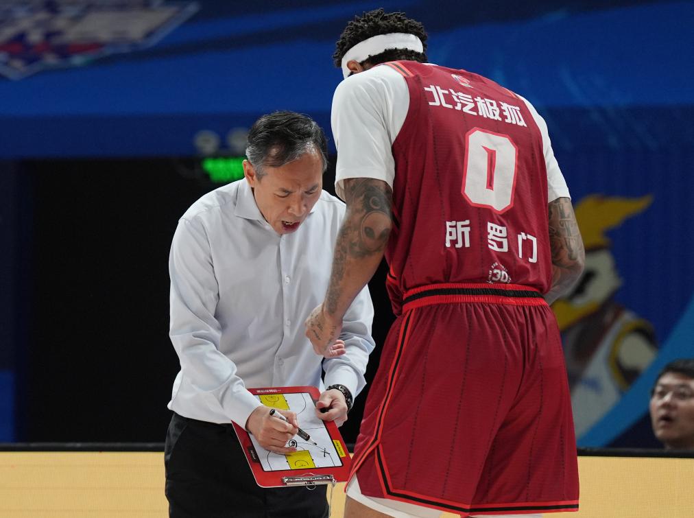 5月14日,北京隊主教練許利民(左)在總決賽第四場比賽中向外援所羅門佈置戰術。新華社記者 張晨霖 攝