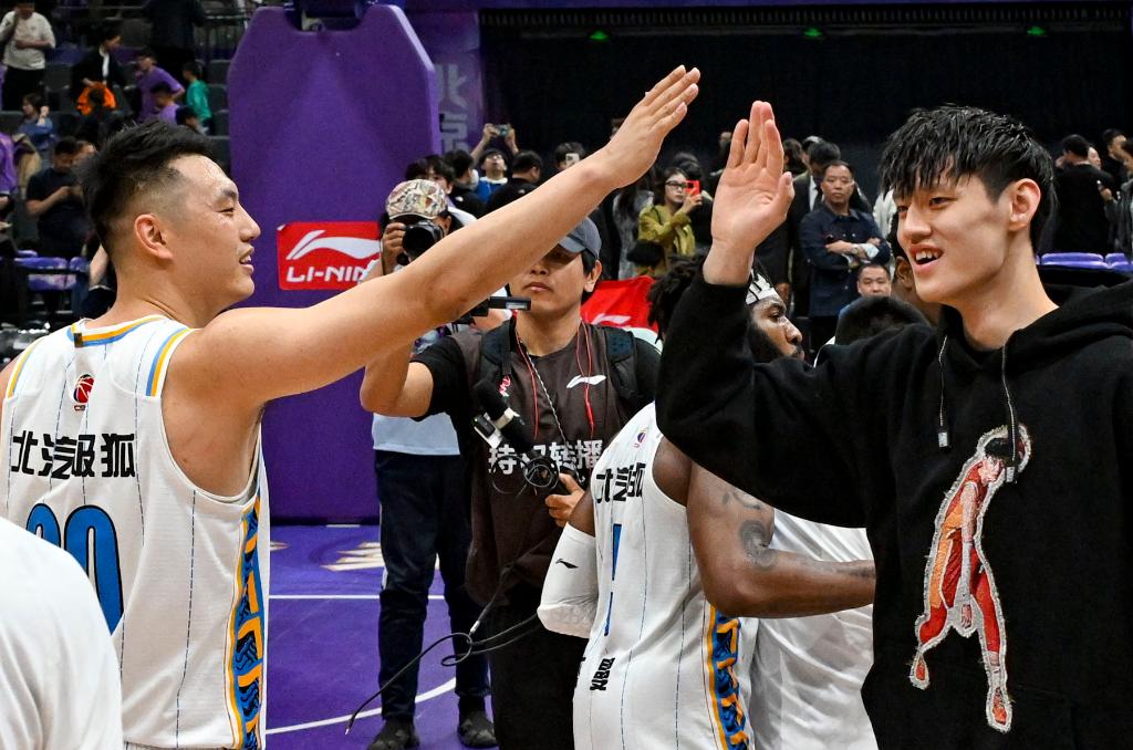 4月19日,北京隊球員翟曉川(左)在季後賽第二輪第三場比賽獲勝後與隊友曾凡博(右)慶祝。新華社記者 陳朔 攝