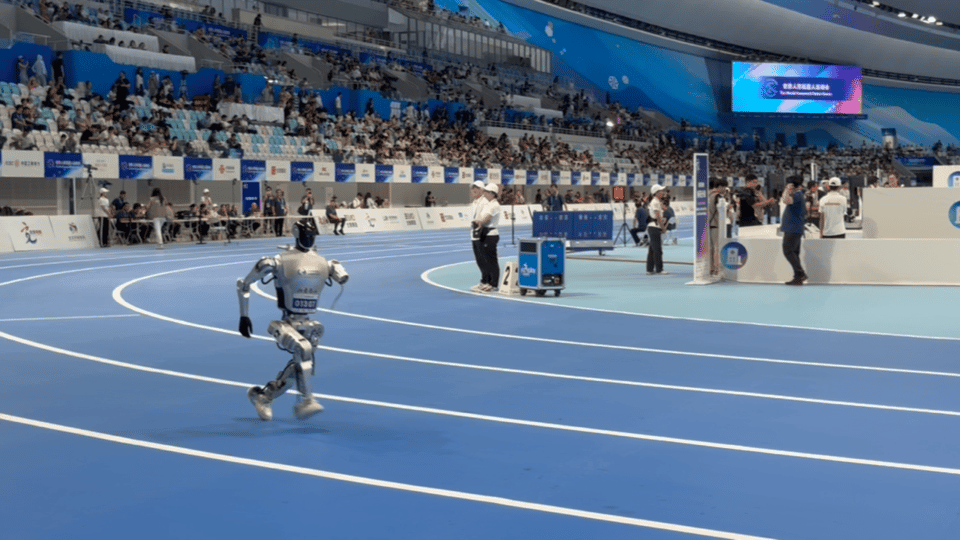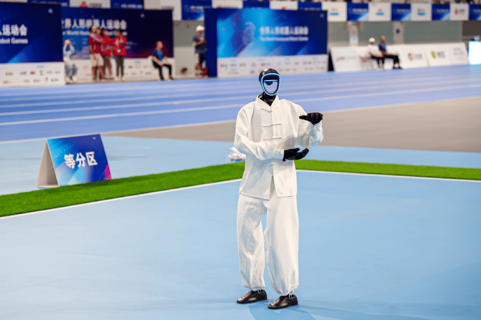 8月15日,獲得人形機器人群體舞蹈比賽冠軍的人形機器人(前)在頒獎儀式後。新華社記者 鞠煥宗 攝