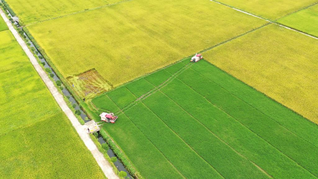 8月22日,在湖南省邵陽市隆回縣司門前鎮石山灣村,農民駕駛農機收割稻穀(無人機照片)。處暑節氣到來之際,農民搶抓農時開展農事勞作。新華社發(曾勇攝)