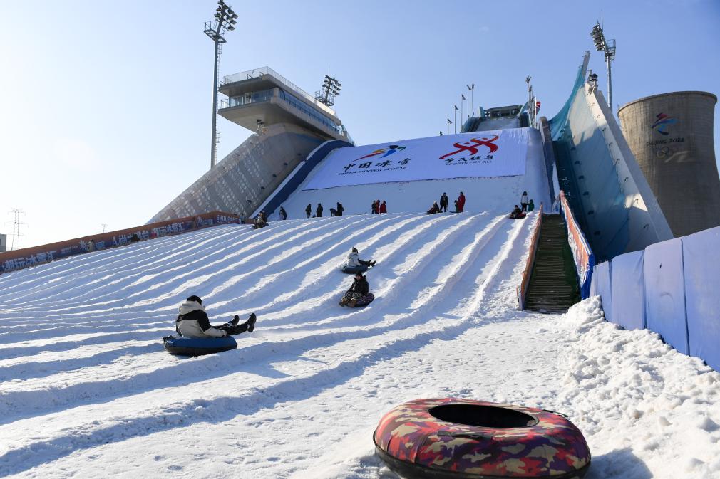 2023年12月24日,游客在首鋼滑雪大跳&體驗“雪圈沖浪”。新華社記者 鞠煥宗 攝