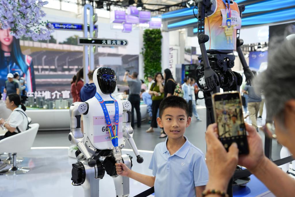 9月13日,在電信、計算機和信息服務專題展區北京方案展展&,小朋友和機器人馬拉松比賽獲獎機器人合影。