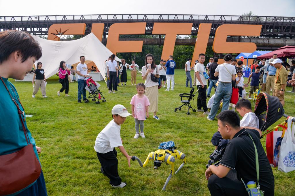 9月13日,在北京首鋼園,小朋友在2025年服貿會文旅服務戶外展區與AI具身智能機器人“AI小螞ROBOT”互動。