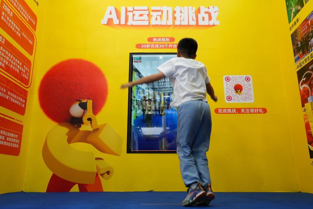9月13日,在體育服務專題展區橙獅慧影展&,小朋友體驗“AI運動挑戰”項目。