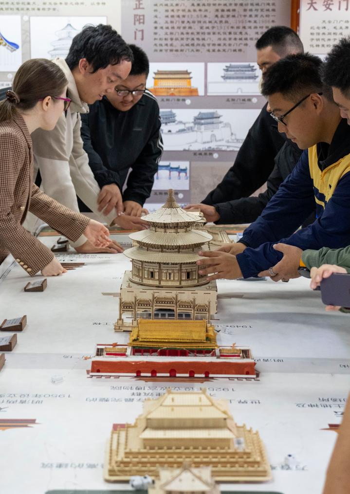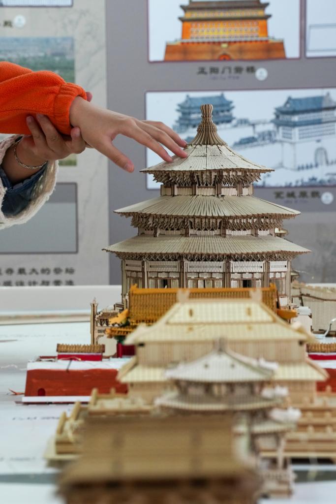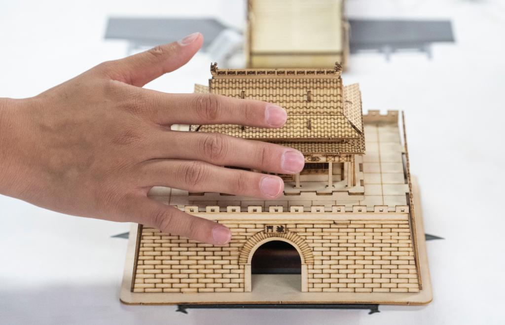 10月13日,視障人士在工作人員幫助下,觸摸北京中軸線建築模型。