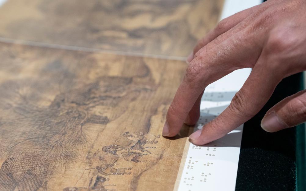 10月13日,視障人士在發布會後,欣賞無障礙版《觸摸故宮珍寶》中的黃庭堅草書《諸上座帖》。