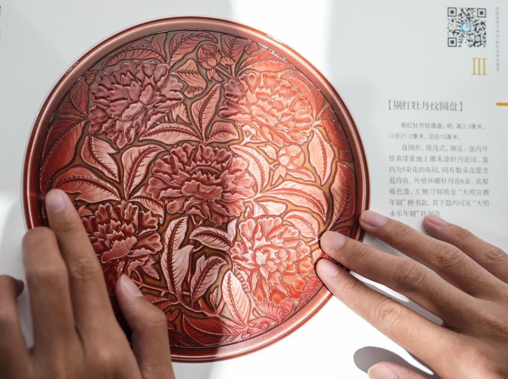 10月13日,視障人士在發布會後,欣賞無障礙版《觸摸故宮珍寶》中的剔紅牡丹紋圓盤。