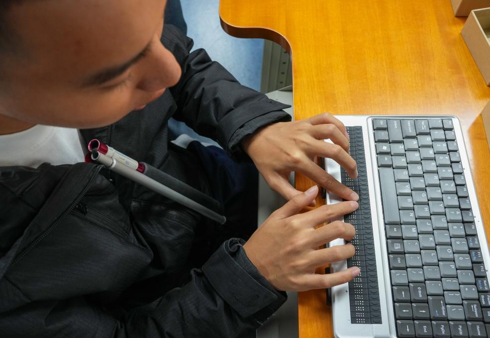 10月13日,視障人士在發布會後,體驗有點顯器的盲文筆記本電腦。 記者:才揚、殷剛