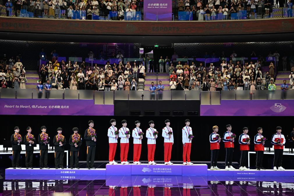 2023年9月26日,在杭州亞運會電子競技王者榮耀亞運版本決賽中,中國隊以2比0戰勝馬來西亞隊,獲得冠軍,圖為冠軍中國隊(中)、亞軍馬來西亞隊(左)和季軍泰國隊在頒獎儀式上。新華社記者 顏麟蘊 攝