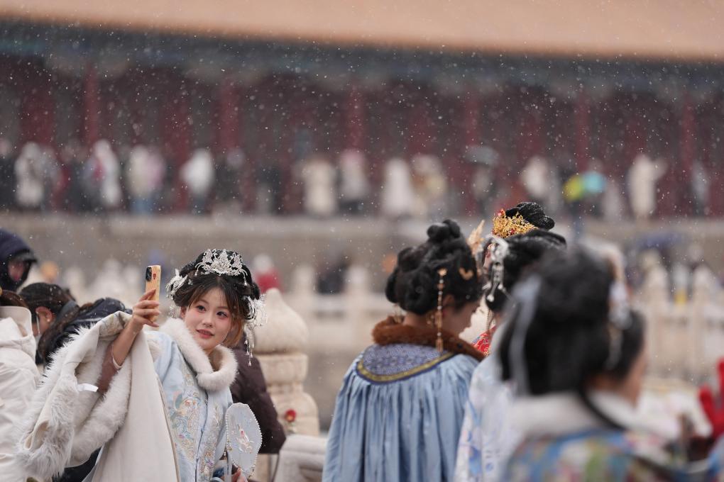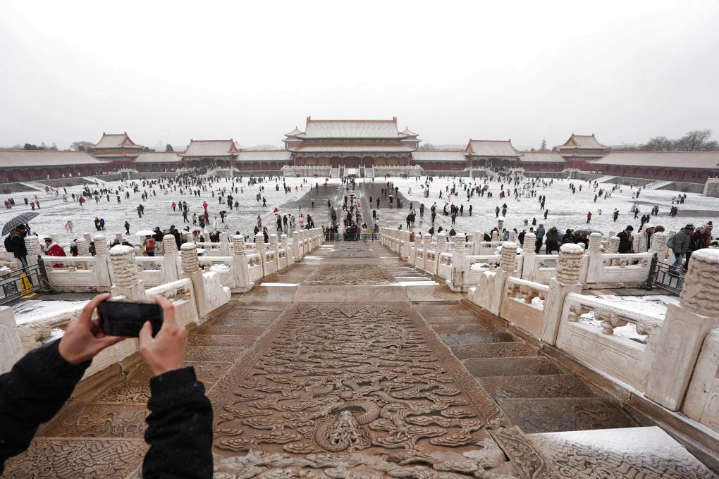 12月12日,游客在北京故宮賞雪拍照。