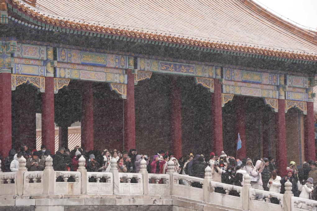 12月12日,游客冒雪參觀北京故宮。