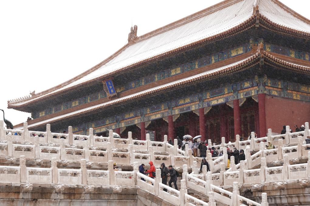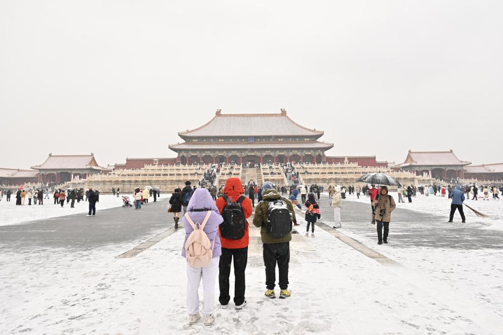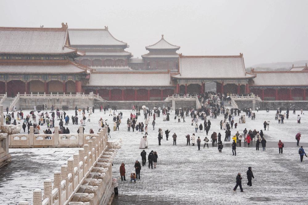 12月12日,游客在北京故宮冒雪游覽。