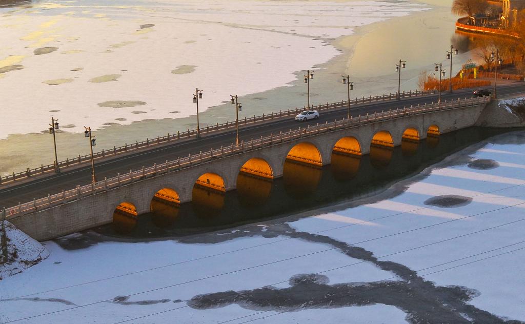 近日,在甘肅省張掖市甘州區濱河新區九孔橋拍攝的“金光穿洞”景觀(無人機照片)。冬日時節,各地美景繽紛如畫,吸引眾多游客賞景游玩。新華社發(陳禮攝)