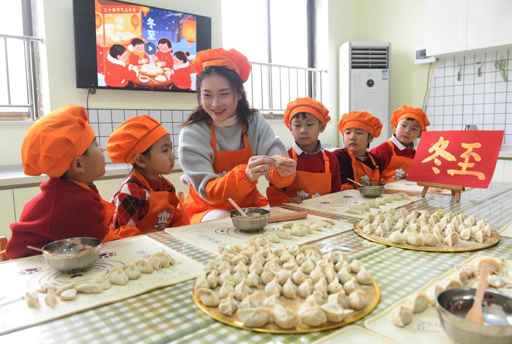 近日,浙江省湖州市德清縣乾元鎮第一幼兒園小朋友在包餃子。冬至到來之際,各地舉辦豐富多彩的民俗活動迎接冬至。新華社發(倪立芳攝)