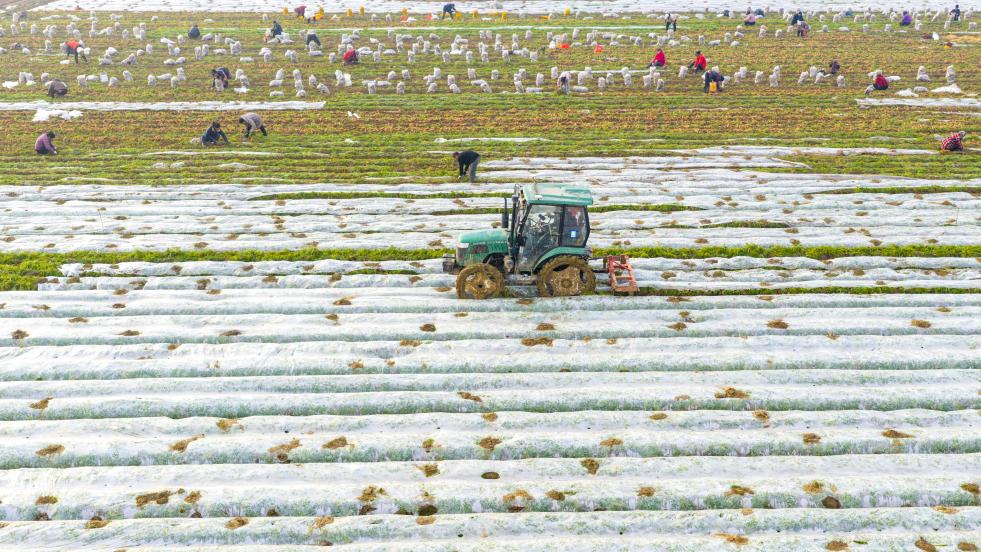 近日,河南省商丘市睢縣董店街道趙樓村村民在田間地頭采收胡蘿蔔(無人機照片)。冬日時節,各地農民搶抓農時,積極開展冬季農業生産活動。新華社發(徐澤源攝)