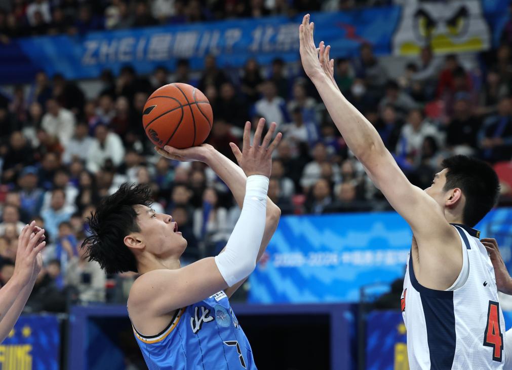 2026年1月1日,2025-2026賽季中國男子籃球職業聯賽(CBA)常規賽第九輪,北京隊球員曾凡博(左)在對陣廣東隊的比賽中投籃。新華社記者 張晨霖 攝