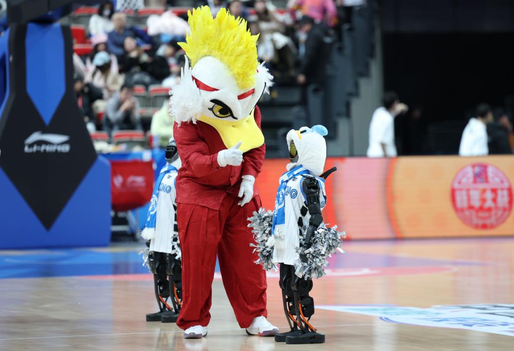 2026年1月1日,2025-2026賽季中國男子籃球職業聯賽(CBA)常規賽第九輪,北京隊與廣東隊比賽的中場休息時,人形機器人在為現場觀眾表演。新華社記者 張晨霖 攝