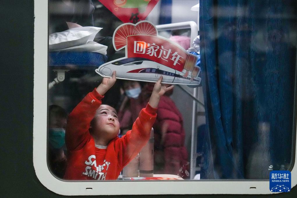 2025年1月13日,在北京地區春運首趟旅客列車發車前,一名小乘客拿着“回家過年”的標牌在車廂內玩耍。 新華社記者 鞠煥宗 攝