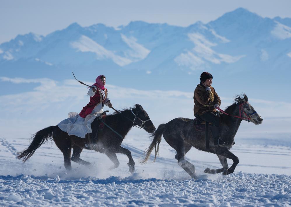 牧民在新疆昭蘇縣濕地公園為游客展示非遺“姑娘追”。新華社記者 胡虎虎 攝
