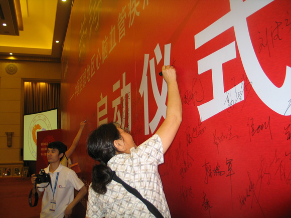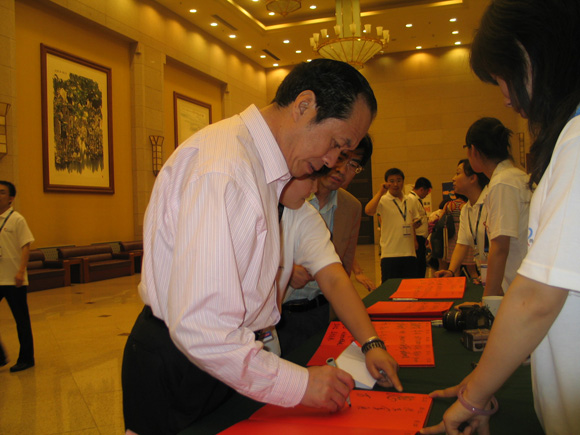 嘉賓在活動背景板上簽名(圖)