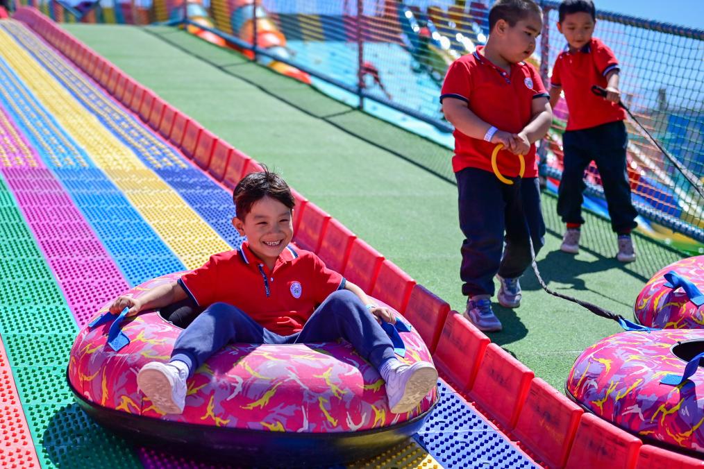 在新疆塔城地區額敏縣郊區鄉甘泉村,孩子們在花海無動力樂園玩耍(5月30日攝)。