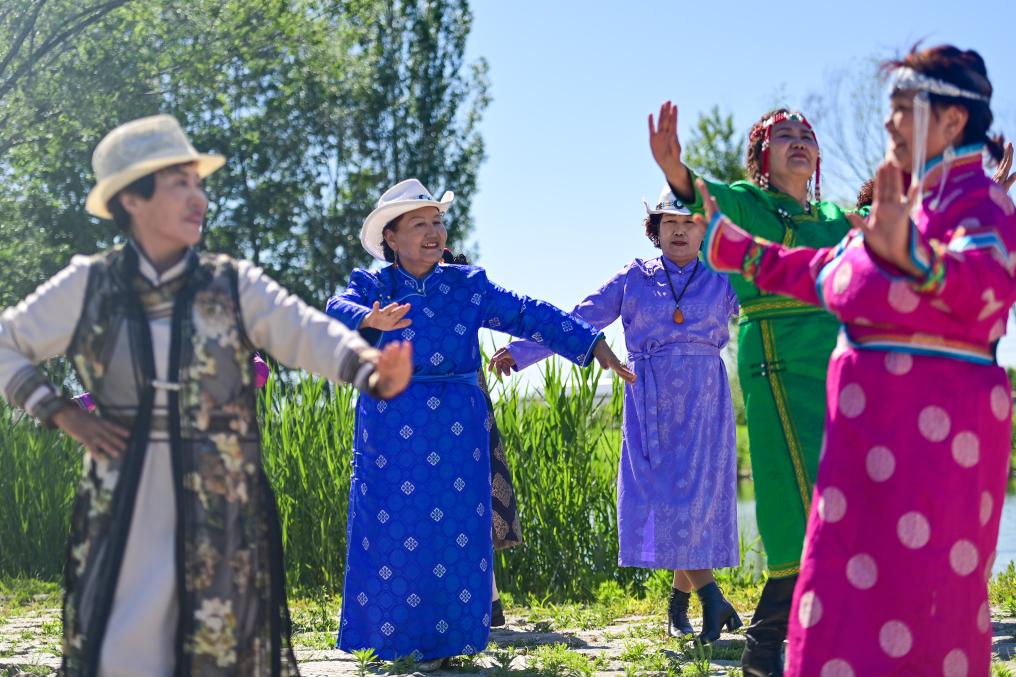 在新疆塔城地區額敏縣額瑪勒郭楞蒙古民族鄉恰爾格阿吉爾幹村“水墨青灣”田園,村民跳起舞蹈歡迎遠方來客(5月30日攝)。