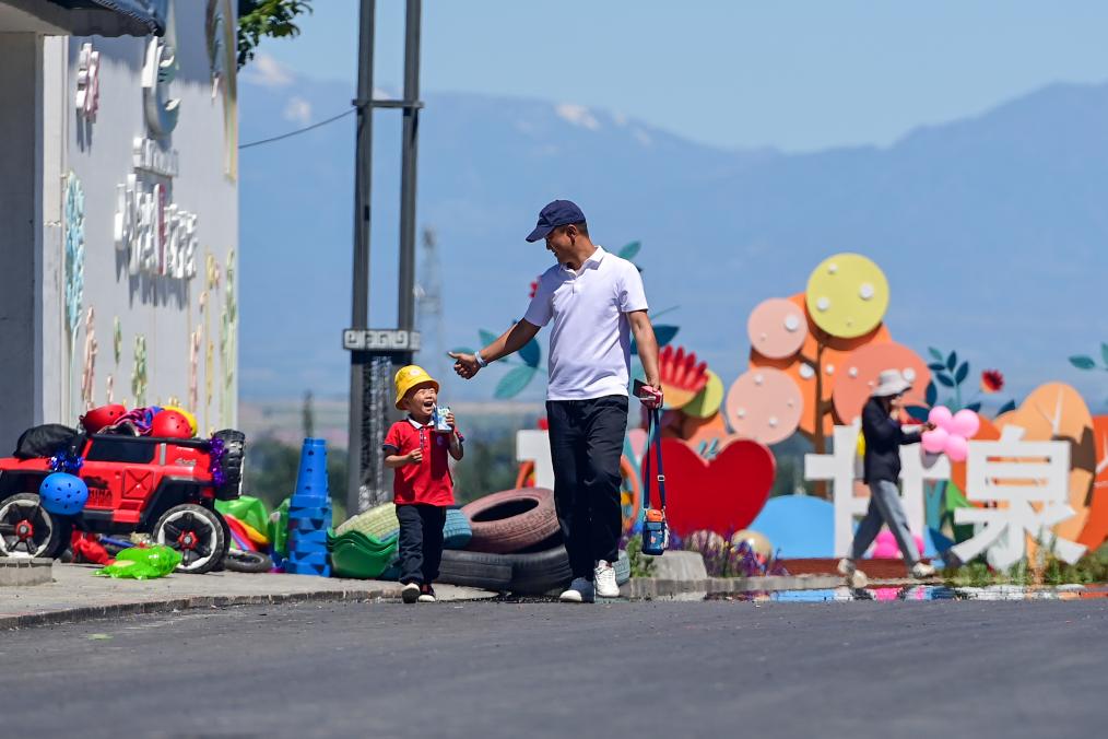 在新疆塔城地區額敏縣郊區鄉甘泉村,家長帶着孩子在花海無動力樂園游玩(5月30日攝)。