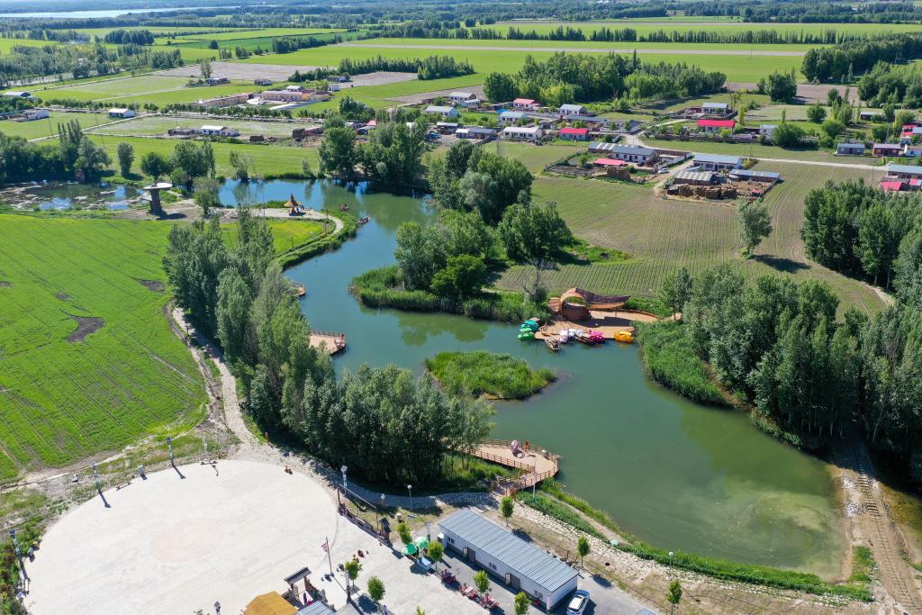 這是5月30日拍攝的新疆塔城地區額敏縣額瑪勒郭楞蒙古民族鄉恰爾格阿吉爾幹村“水墨青灣”田園(無人機照片)。