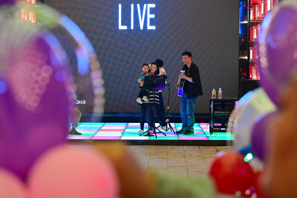 在新疆塔城地區額敏縣東街夜市,表演樂隊和游客互動(5月29日攝)。