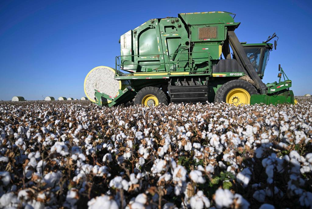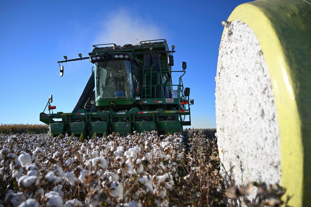 採棉機在新疆生産建設兵團第六師五家渠市105團的棉田采收棉花,由採棉機自動完成打包的棉花擺放在田間(9月29日攝)。