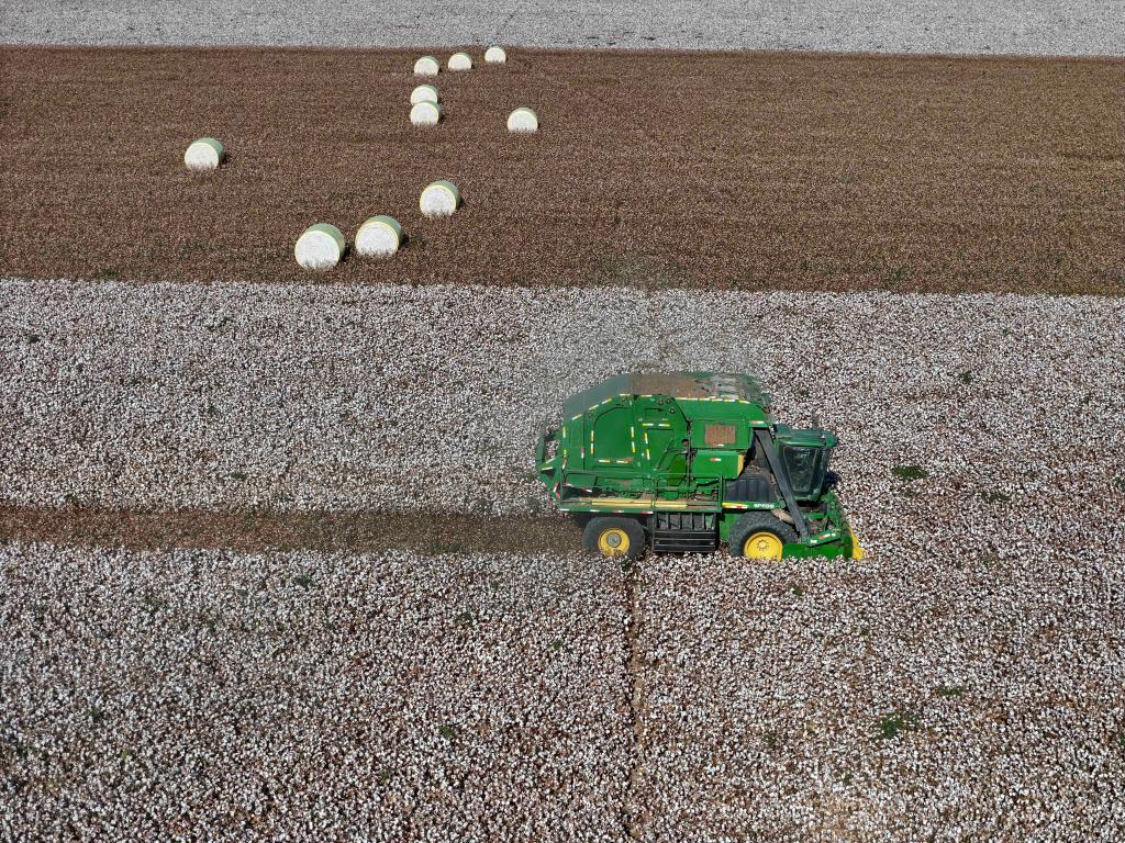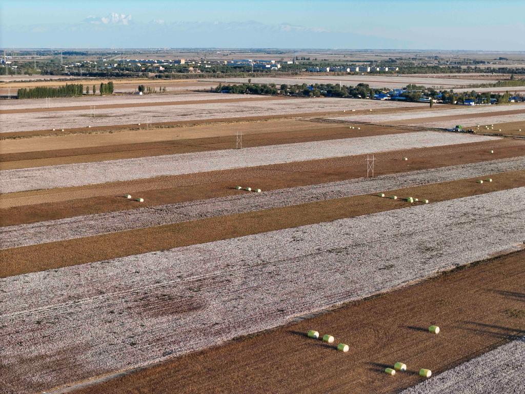採棉機在新疆生産建設兵團第六師五家渠市105團的棉田采收棉花,由採棉機自動完成打包的棉花擺放在田間(9月29日攝,無人機照片)。