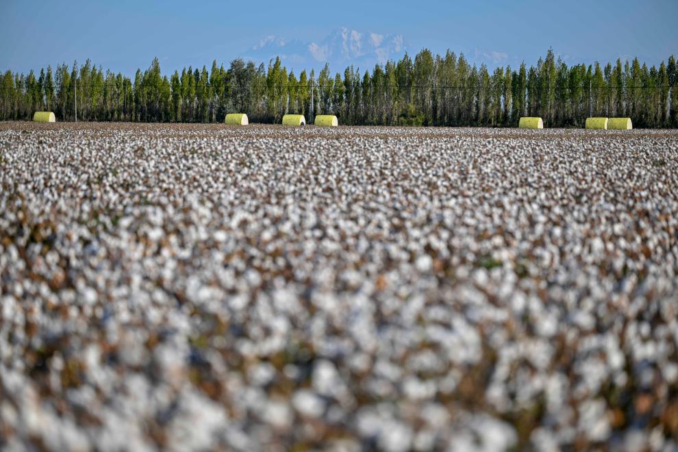 這是9月29日在新疆生産建設兵團第六師五家渠市拍攝的棉田,遠處的天山雪峰隱約可見。