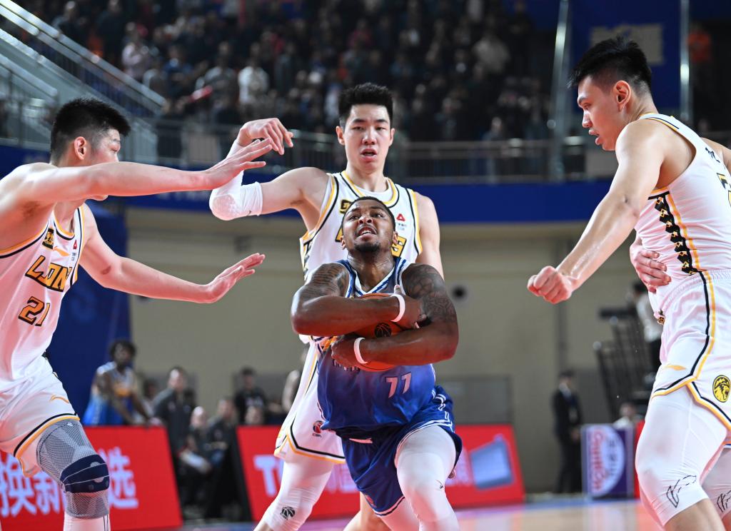 11月3日,新疆伊力特隊球員伊力福拉提(中)在浙江方興渡隊球員奈特(右)、朱俊龍的夾擊防守下投籃。