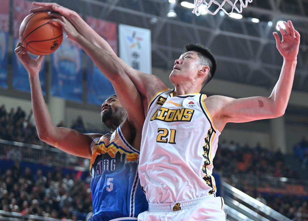 11月3日,浙江方興渡隊球員胡金秋(右)與新疆伊力特隊球員勞森在比賽中拼搶籃板球。