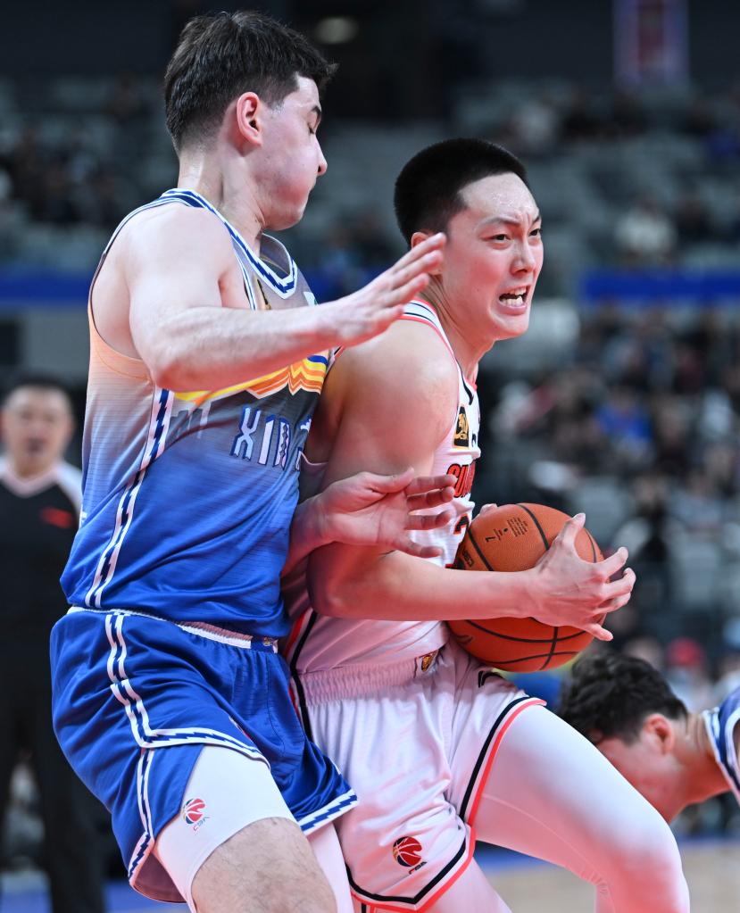 3月10日,新疆伊力特隊球員趙睿(右)突破廣東東陽光隊球員徐傑的防守。 新華社記者 胡虎虎 攝