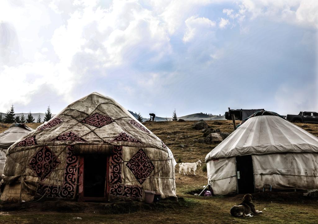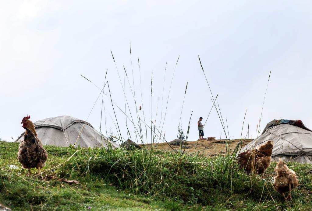 7月29日,一位牧民抱着孩子在氈房門口張望。